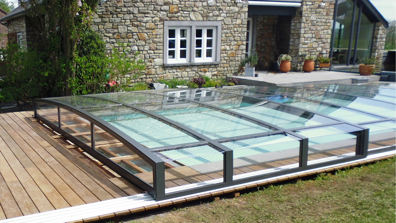 Flache Poolüberdachungen sind immer dann besonders geeignet, wenn es darum geht, Sicht und Optik eines Gartens nicht zu beeinträchtigen, Wetterschutz und Sicherheit aber gewährleistet werden soll.