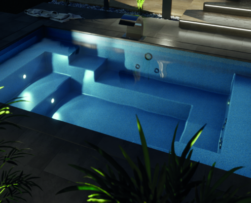 Dieses Becken hat eine integrierte Relaxzone und ist damit Spa und Schwimmbecken in einem. Optionale Ausstattung mit Rollladenschacht oder Schiebeholzdeck sind möglich. Perfekt für kleine Gärten – kombiniert mit einer Gegenstromanlage!
